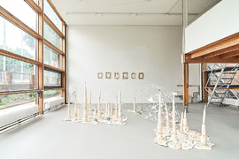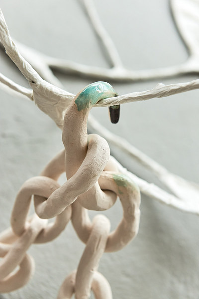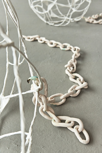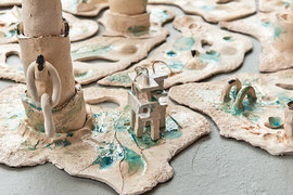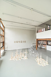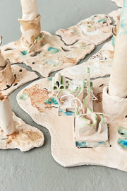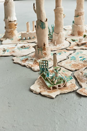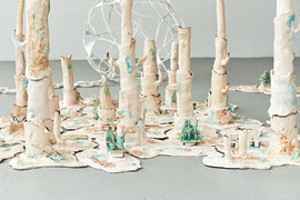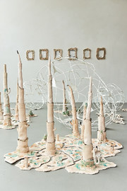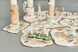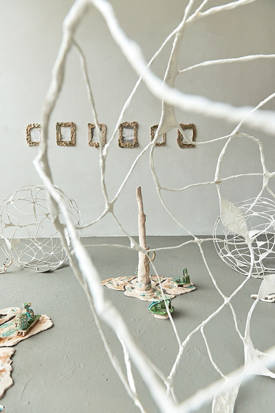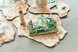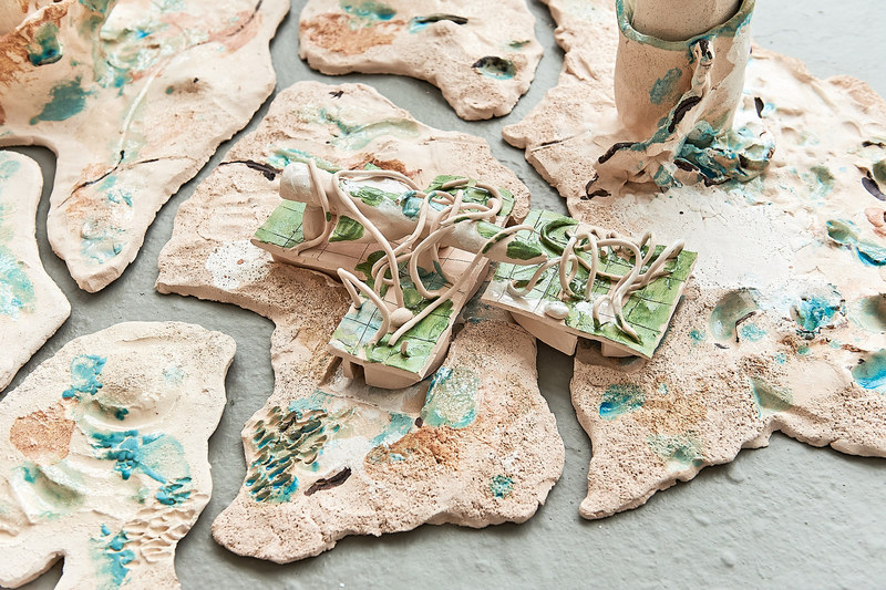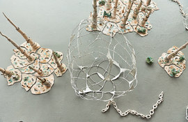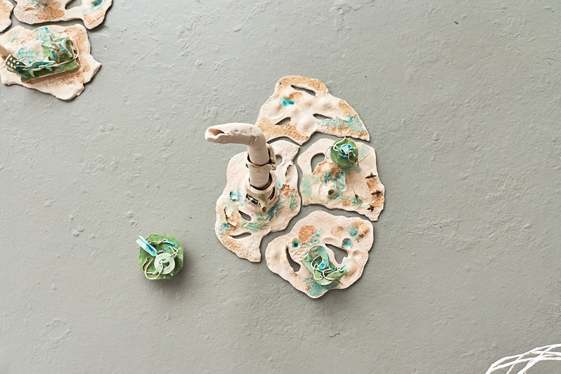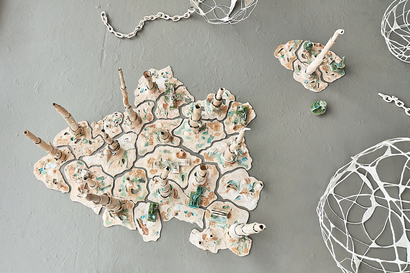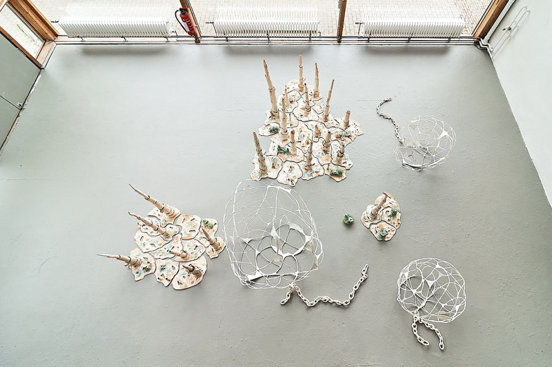Sculptural project of Anna Bochkova reflects her research towards futuristic utopia. Bochkova creates a speculative space of imaginable future where on remnants of familiar landscape humans are driven to learn how to communicate differently with surroundings. They apply absolute care, they wear protection suits in order not to damage that little what is left, they speak with stones and learn from plants how to subsist on solar energy.