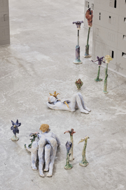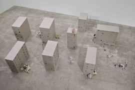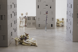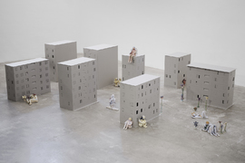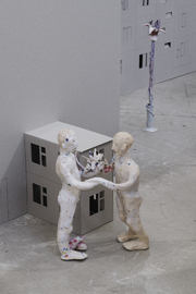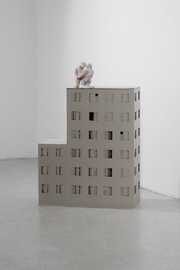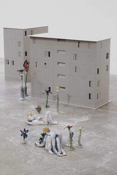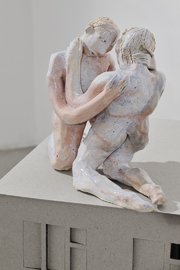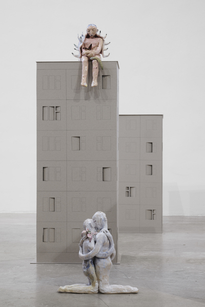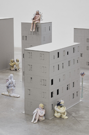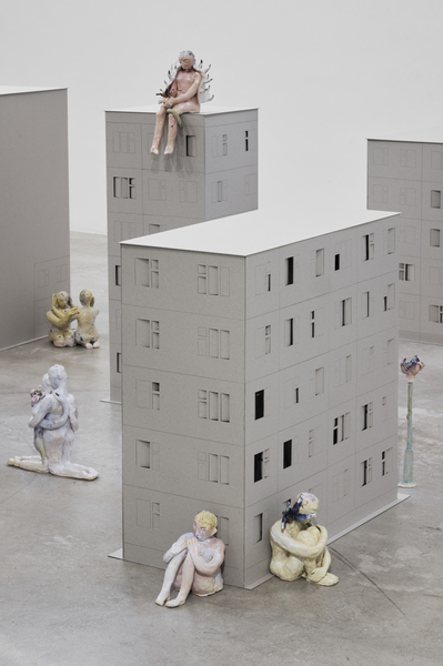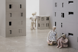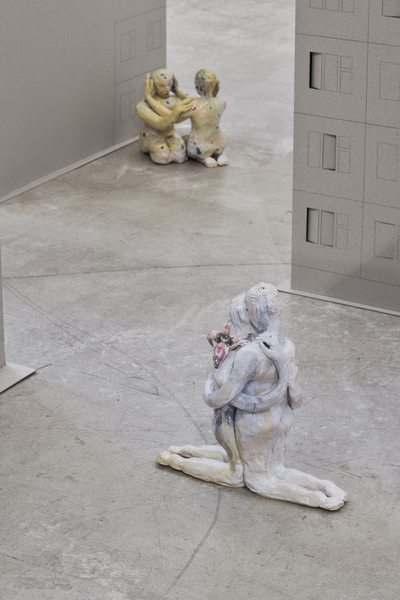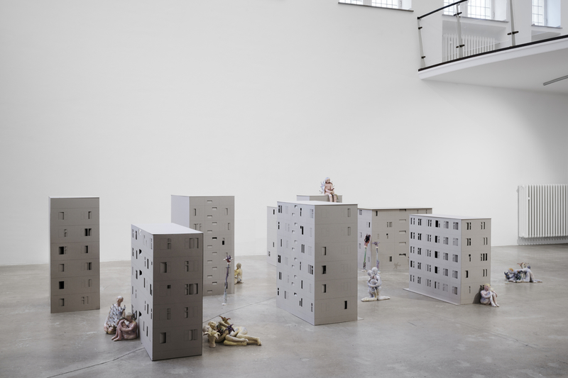 The exhibition ‘Armoured Concrete’ brings together two groups of works. On the one hand, facades of prefabricated buildings made of cardboard, on the other, figurative ceramic figures of people with