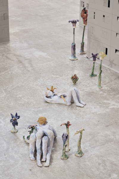 most oxygen, Bochkova's ceramic figures carry flowers into the spaces between the buildings to show tenderness and beauty, to plant something that will stand firm even in the wind. The gesture of