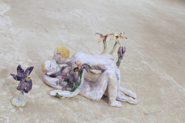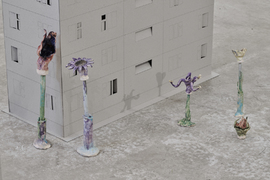 In the artothek, Bochkova places fragile ceramic figures, which meet in poetic and tender gestures, between prefabricated buildings made of simple grey cardboard. In the context of so-called "social hotspots", she places the longing for love, innocence and a protected togetherness. The figures carry flowers into the spaces between the buildings to sow tenderness and beauty, to plant something there. This touches and shakes up the images and ideas that we associate with prefabricated housing estates, and perhaps also with Eastern Europe.