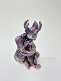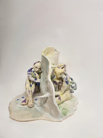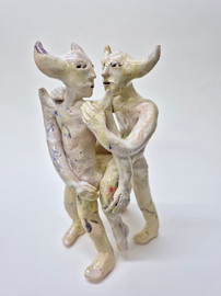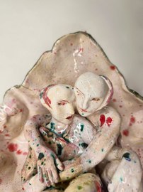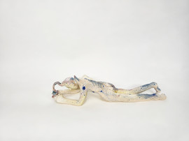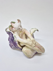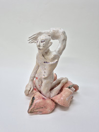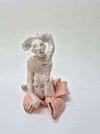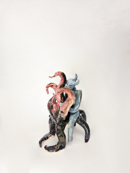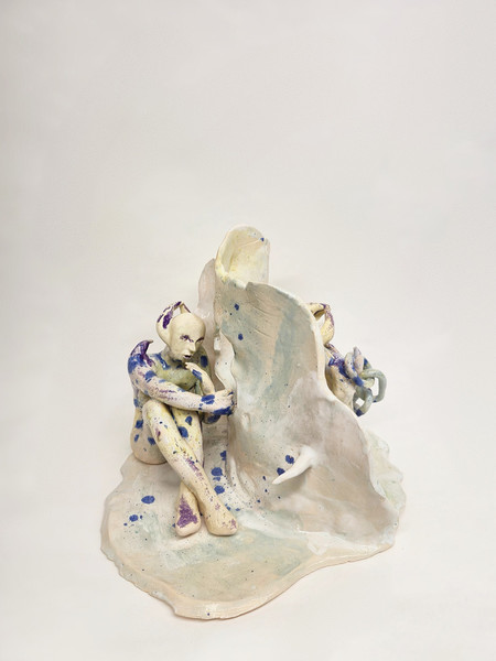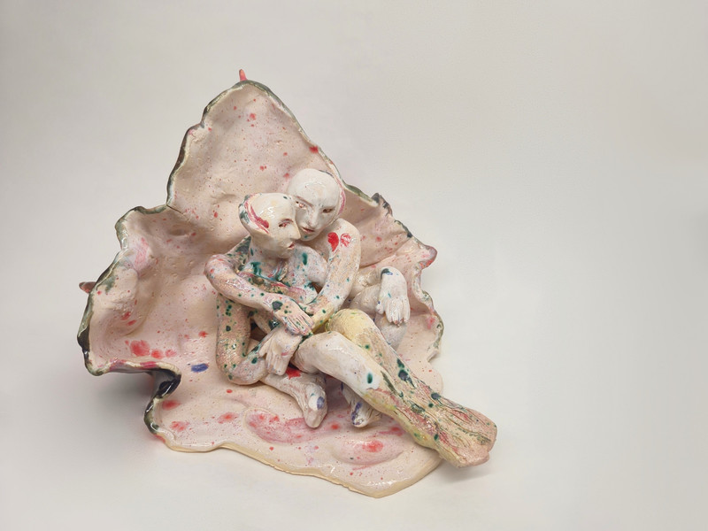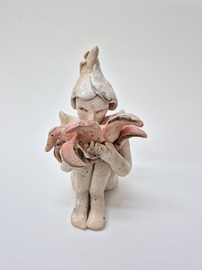 figure embraces a wounded home. These hybrid beings embody metamorphosis, ambiguity, loss, and care. Their fragile materiality becomes a metaphor for resilience—delicacy that holds strength