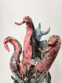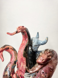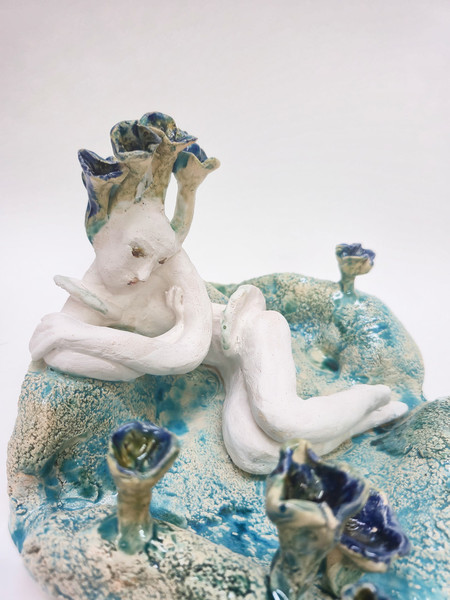 Anna Bochkova’s ceramic sculptures exist in a space between softness and confrontation, between mythology and science fiction. Human figures emerge from flowers, a house blooms like fire, a female