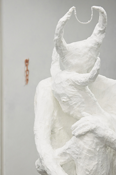 I see myself as an alien, who is fluidly moving through worlds where I need to adjust, transform and change, shaped by dislocation, memory, and difference. The figures with sprouting horns, thorns, and other unfamiliar features reflect this sense of otherness, not as something to be feared, but as a site of potential connection. These forms are kept in gestures of tenderness, evoking a sense of togetherness and community.