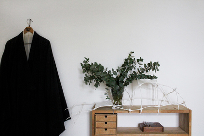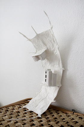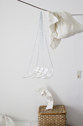 ‘Kvartirnik’ presents five artistic positions in four different locations, reconstructing one united Viennese flat. We enter the bright living room with Daniela Grabosch, where a single textile piece hangs on the door like a giant rose petal and a video quietly plays on her phone with its cold, cautious voice. We later step into the bedroom with delicate sculptures by Anna Bochkova, haphazardly occupying the small space. Then we peak in the bathroom with Natalia Gurova and go down the staircase, flying over her bright silicone sculptures. Finally, there is a backyard with works by Danielle Pamp and Siggi Sekira—to gulp a breath of fresh air like a miniature ceramic sculpture overgrown by thistles, or to imagine a familial hug.