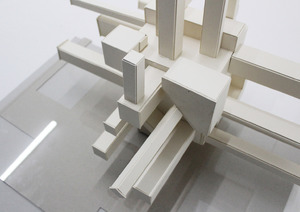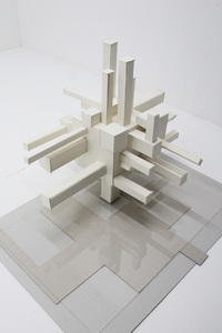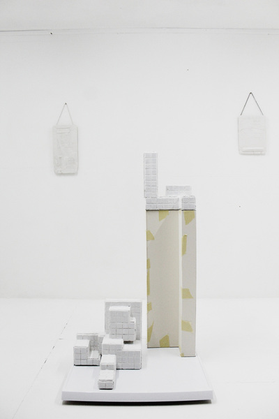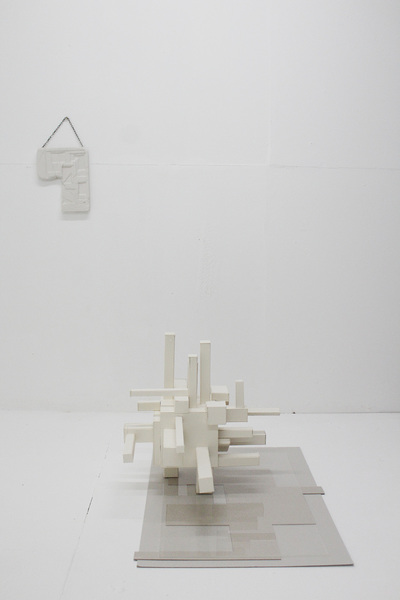 Within this white cube which protrudes in the school’s assembly hall we can observe the references to modernist avant-garde movements such as constructivism, suprematism and rationalism (floor pieces), which are opposed to the mapping analyses of algorithmic social housing panel block which are the true body of the most eastern cities (wall pieces).