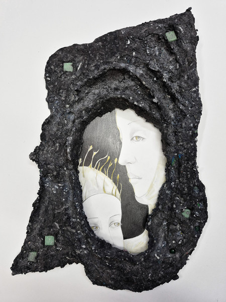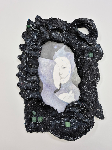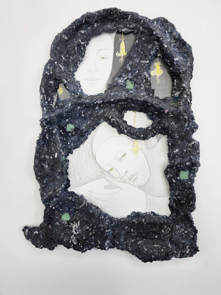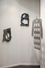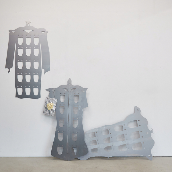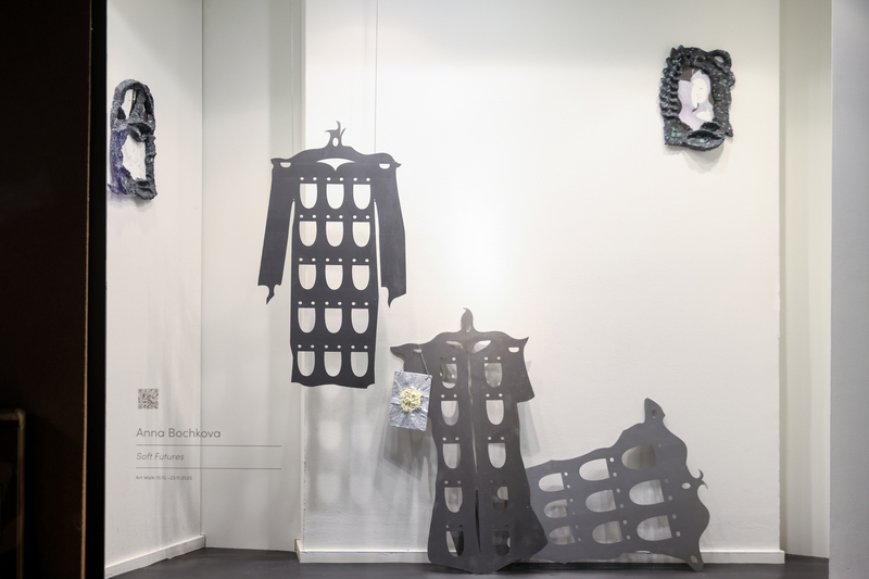 Soft Futures showcases two interrelated works that explore care, resistance, and soft transformation through small gestures and intimate materials. Gestures of Care – Framed Futures is a drawing series set inside papier-mâché frames made from the artist's upcycled residency documents and visa papers. These materials—once tools of restriction—now hold tender scenes of connection between beings in imagined futures. The fragile structures are porous and soft, inviting openness rather than control. In her practice, Anna Bochkova explores tenderness in rigid and tough environments, weather historically or in the sense of speculative futures. In dialogue with this, Hidden Pockets is a sculptural work made of laser-cut steel, shaped like three jackets with forms reminding pockets. It draws on the history of how, in medieval times, women pockets were suspected of witchcraft—carrying knowledge or power that wasn’t allowed. Today, pockets still symbolize autonomy, privacy, and agency—especially for women. Working with the figure of the witch and dangerous femininity, Anna Bochkova creates sculptures which are filled with different narratives and codes.