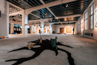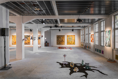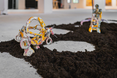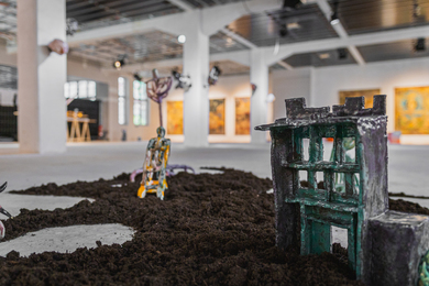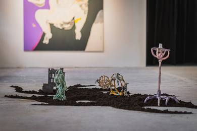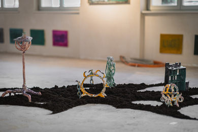 The installation ‘Sometimes I sleep but not yet fully’ presents a conundrum of visual scape which forms an environment for mental figures (ceramic sculptures) arising from it. There work reflects and