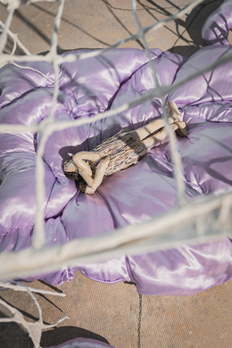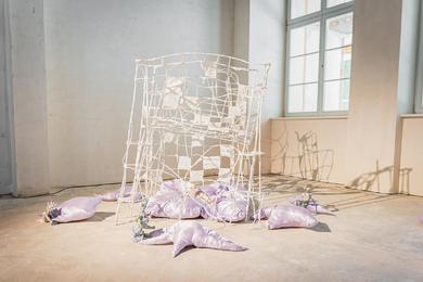 memories. In this work papier-mâché structure recreates bed and cradles but as a semi closed heterotopic space which is never completely safe or isolated. The figurative sculptures are reflecting
